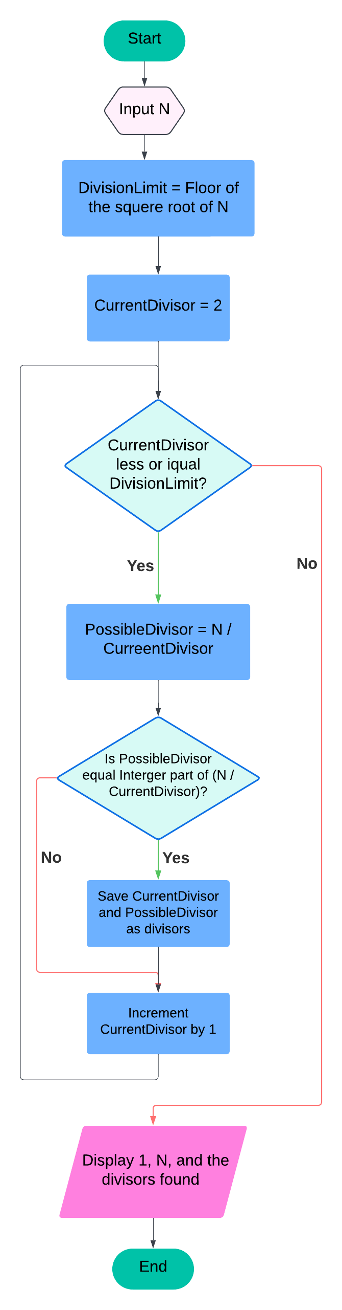 A lo largo de esta explicación, proporcionamos un diagrama de flujo para visualizar el proceso paso a paso, mejorando la comprensión del algoritmo. También ajustamos los nombres de las variables para hacerlos más intuitivos y alineados con el propósito de encontrar divisores de un número.